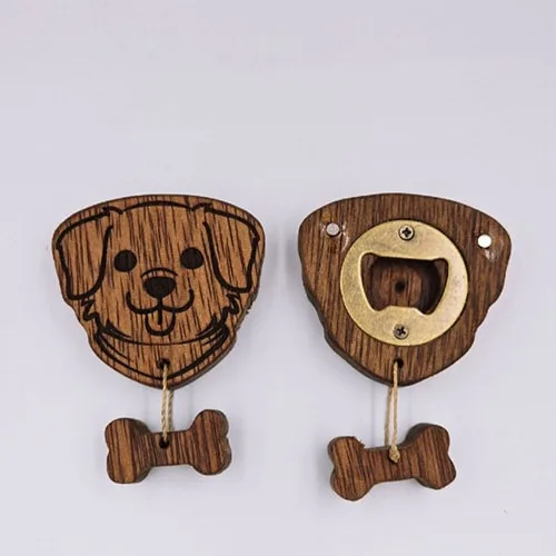 Práctico y lindo destapador elaborado en maderas variadas en forma de perrito labrador. Incluye imán para que pueda ser colgado en la refrigeradora.