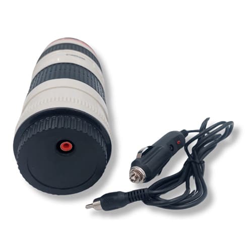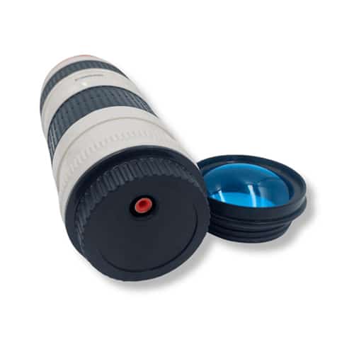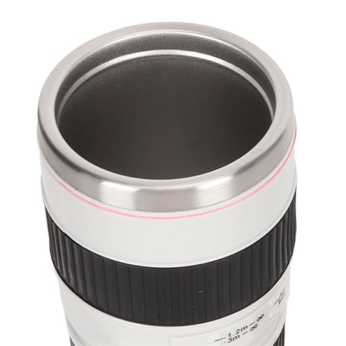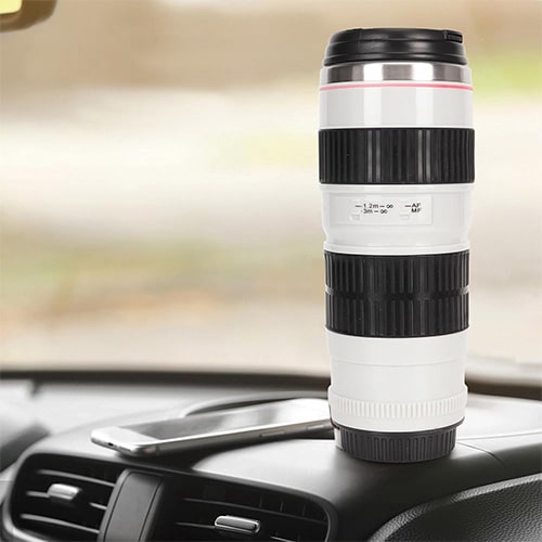 Con la apariencia de un lente de cámara profesional, este vaso mantendrá caliente tu bebida XD